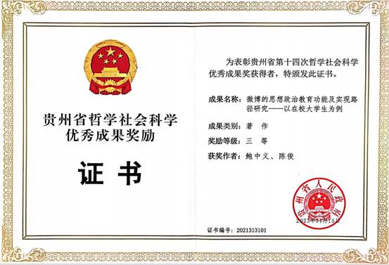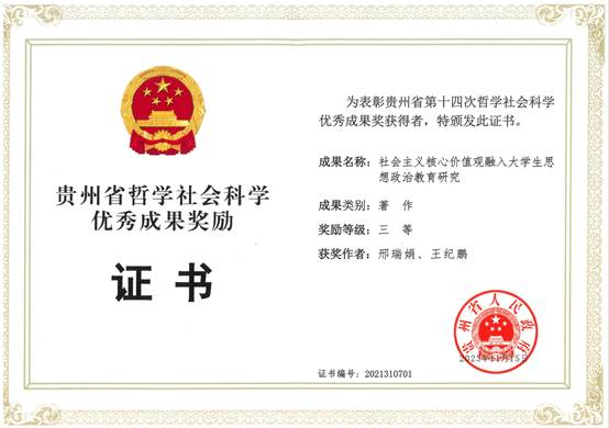近日,贵州省第十四次、十五次哲学社会科学优秀成果奖颁奖大会在贵阳召开,公司党委委员、副董事长龚其海教授带领获奖教师出席本次颁奖大会。公司珠海校区太阳集团tyc539谢仁生教授荣获贵州省第十四次哲学社会科学优秀成果奖著作类一等奖,实现了公司哲学社会科学优秀成果一等奖零的突破。校本部太阳集团tyc539邢瑞娟教授、王纪鹏教授及鲍中义教授、陈俊教授分别荣获著作类三等奖。本次获奖实现了公司哲学社会科学优秀成果“一等奖”的突破,进一步彰显了公司教师的科研能力和水平,极大鼓舞了公司广大教师的科研积极性。贵州省哲学社会科学优秀成果奖由贵州省人民政府颁发,系贵州省哲学社会科学领域的最高奖项。此次获奖的三项成果均属于马克思主义理论学科领域成果,有力夯实了公司马克思主义理论团队建设。截止到现在为止,太阳集团tyc539荣获该奖已达六项。