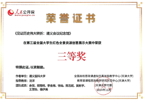 全国老员工红色全景资源创意展示大赛旨在守正创新推动思政课建设内涵式发展,不断提高思政课的针对性和吸引力,发挥好红色数字资源在思政育人中的独特作用,开创新时代思政教育新局面。《见证历史伟大转折:遵义会议纪念馆》主创团队根据在思政课中的学习收获,积极参加“行走的思政课”实践教学活动,挺膺担当遵医青年对于传播红色文化的光荣使命,运用虚拟现实等数字技术,使用科学规范的语言文字,全景展示遵义会议会址红色资源,生动讲述遵义会议的伟大转折意义,引领广大青少年传承赓续遵义会议精神。同时,本作品的创作和获奖,恰逢遵义会议召开90周年之际,具有重要推广价值和纪念意义。(转载来源:公司团委)