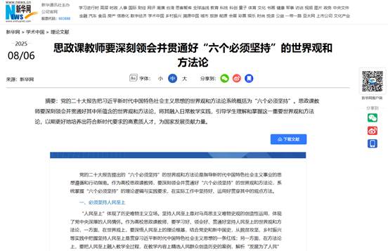 近日,国内官方权威媒体新华网“学术中国”栏目刊登公司太阳集团tyc539邢瑞娟教授理论文章《思政课教师要深刻领会并贯通好“六个必须坚持”的世界观和方法论》,该文就“六个必须坚持”的世界观和方法论结合思政课展开了深入理论论述。