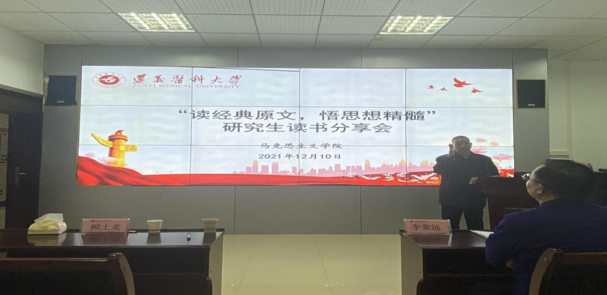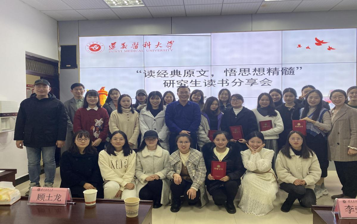 为了丰富太阳集团tyc539研究生的课余生活,鼓励同学们静下心来阅读经典,在经典著作中获得启迪和营养,太阳集团tyc539于12月10日下午14:00,在313多功能厅举办了“读经典原文、悟思想精髓”研究生读书分享活动,太阳集团tyc539原社科部主任顾土龙教授、太阳集团tyc539班子成员李荣远、谷松岭、鲍中义及纲要教研室主任杨艳出席了本次活动,思想政治教育和人文医学两个专业的全体研究生参加此次活动,读书活动由学习部部长张航航同学主持。